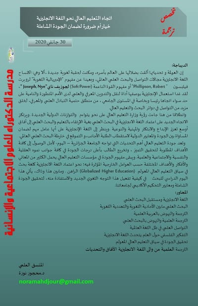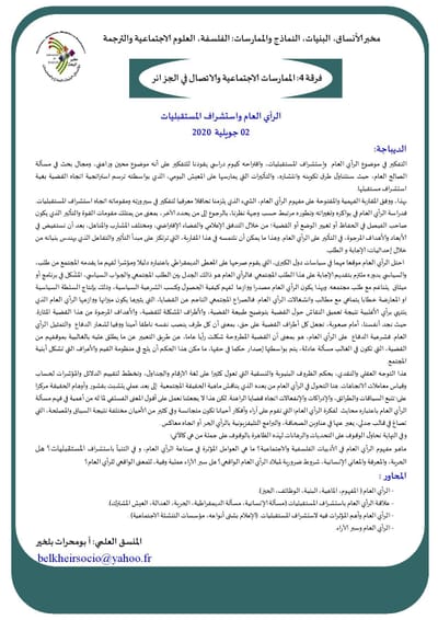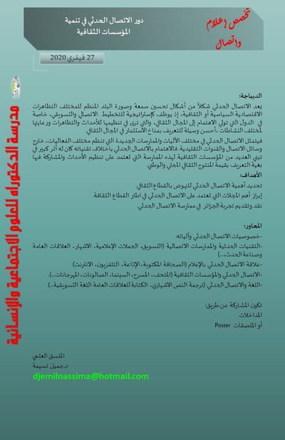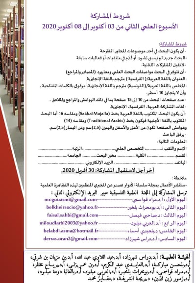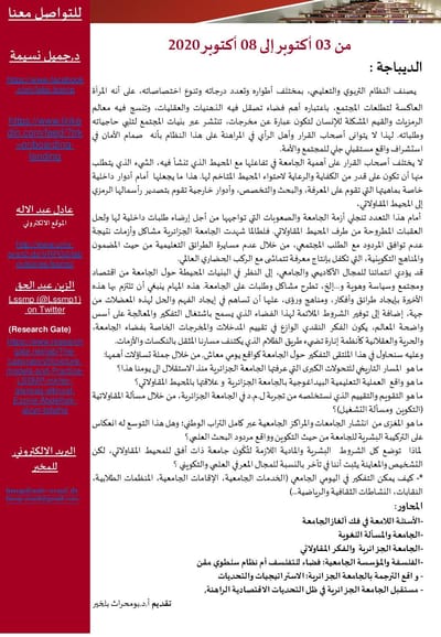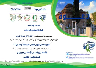 سلسلة لقاءات يعقدها: مخبر الأنساق، البنيات، النماذج والممارسات (LSSMP) مخبر الفلسفة وتاريخ الزمن الحاضر ( PHTP ) بجامعة وهران2 محمد بن احمد والجمعية الجزائرية للدراسات الفلسفية الضيافة الثانية: "العمود الصحفي اليومي النقدي: فضاء للنقد أو السخرية؟" من تنشيط د.صاحبي فيصل، يستضيف السادة: الأستاذ رابح السبـــع، الأستاذ بن عمـر يزلـي الصحفي ماليـــك شقلاليــة، سويح مهدي